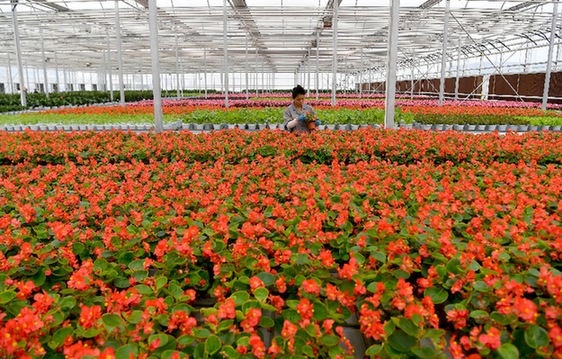 圖為楊凌智慧農(nóng)業(yè)示范園內(nèi),工作人員在管護溫室花卉。