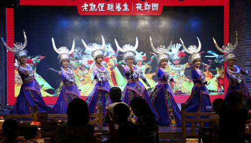 隨著鄒遠(yuǎn)與丁文建走進(jìn)大廳,一場苗族歌舞表演《盛世銀裝》正在上演,藍(lán)色的裙擺蕩出陣陣?yán)嘶?,精美的銀飾秀出眩目光影,苗姑娘們用輕快曼妙的舞姿伴隨著銀鈴發(fā)出的聲音,展示著苗嶺的幸福與歡樂。整場演出將貴州獨(dú)有的苗族文化、服飾特色、歌舞風(fēng)情等原生態(tài)民俗民風(fēng)淋漓盡致地展現(xiàn)在了觀眾面前。