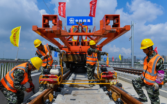 中鐵四局施工人員正在進(jìn)行高鐵長(zhǎng)軌鋪設(shè)作業(yè)。中鐵四局供圖