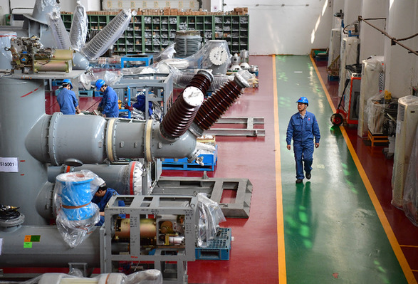 工作人員在中國(guó)西電集團(tuán)西安西電開(kāi)關(guān)電氣有限公司試制車(chē)間巡視設(shè)備。記者 邵瑞 攝