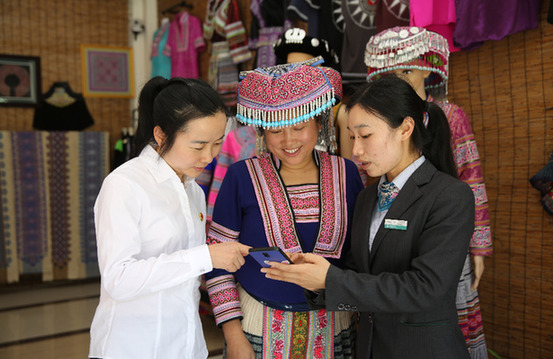 農(nóng)行云南屏邊縣支行有效支持“苗繡”發(fā)展,農(nóng)行職工為合作社負責(zé)人安裝掌上銀行。梁志強 攝
