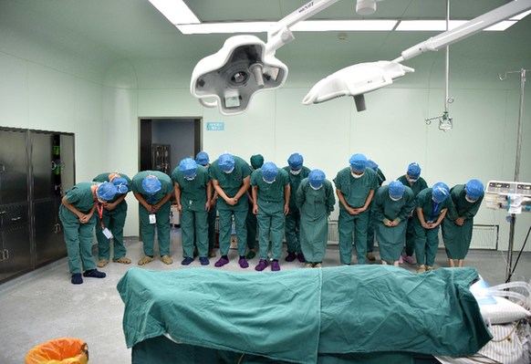 2016年9月29日,在安徽省立醫(yī)院,工作人員向志愿捐獻(xiàn)器官的41歲援藏醫(yī)生趙炬的遺體告別。