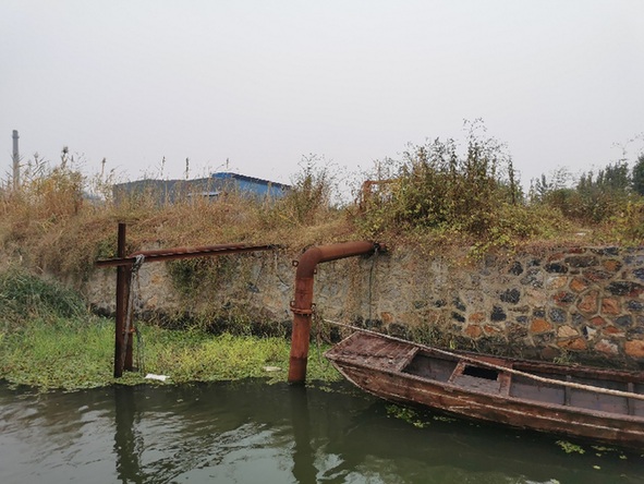 在與微山湖相連的利國河溝,兩根管道一頭在水中,一頭通往岸邊工廠。當?shù)厝罕姺从?,這兩根管子,一個是抽水管,一個是排水管。(記者 邵琨 攝)