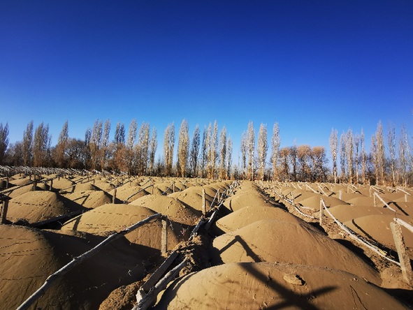 據(jù)介紹,陽關(guān)林場(chǎng)原有高大喬木枯枝落葉腐殖后,有機(jī)質(zhì)多年聚集,促進(jìn)了細(xì)沙成土,改變了沙地性質(zhì),使得流沙趨向固定。而在當(dāng)?shù)胤N植葡萄,枝干需埋土防寒,秋冬埋土、春季出土要進(jìn)行兩次土壤大翻動(dòng),人力作用使得地表沙質(zhì)疏松,形成流動(dòng)沙土。從當(dāng)年11月到翌年4月,葡萄園地表土裸露時(shí)間長(zhǎng)達(dá)半年,而冬春季節(jié)大風(fēng)天氣頻繁,不僅人為制造了大面積沙塵源,還加劇了林地土壤風(fēng)蝕。