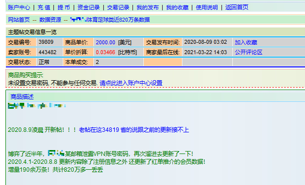 與個人隱私信息售價低廉不同的是,含賭博類會員的信息價格直線上漲。有帖主表示,某體育足球類App郵箱泄露VPN賬號密碼,除了新增2020年4月1日到2020年8月8日的注冊信息外,還更新了紅單推介會員數(shù)據(jù),增量190萬條。值得注意的是,該數(shù)據(jù)包售價高達(dá)2000美元,已有2單成交。