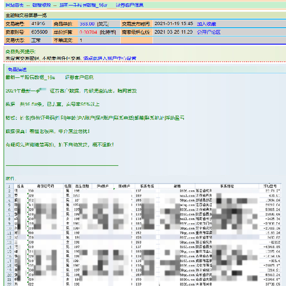 另一個在售的數(shù)據(jù)包為某證券公司多達(dá)16萬的客戶信息,標(biāo)價368美元。發(fā)帖者表示,該數(shù)據(jù)為2021年最新一手客戶數(shù)據(jù),內(nèi)部渠道流出,暗網(wǎng)首發(fā)?!皵?shù)據(jù)一共16.5萬條,已去重,實號率95%以上,數(shù)據(jù)保真?!?/p>