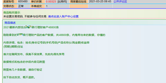 交易編號為41847的帖子顯示,其擁有前述商業(yè)銀行理財客戶數(shù)據(jù)48800條?!霸摂?shù)據(jù)為內(nèi)鬼帶出,首次在暗網(wǎng)發(fā)布,每份售價168美元?!卑l(fā)帖者稱。