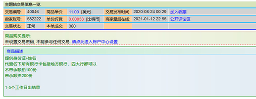除了黑客等技術(shù)人員盜取批量信息之外,也有一些“內(nèi)鬼”直接參與其中。交易編號為40046的帖子顯示:“只要提供身份證和姓名信息,便可代查名下所有銀行卡具體信息,不帶余額1100美元,結(jié)果帶余額需2200美元,1-5個工作日即可出結(jié)果?!敝档米⒁獾氖?,該貼自2020年8月24日發(fā)布以來,目前已交易多達(dá)360單。