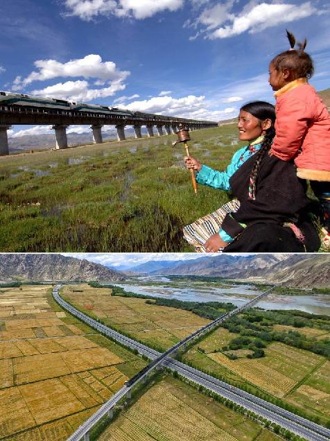 上圖為西藏當雄縣藏族群眾在觀看火車駛過(2006年6月17日記者覺果攝);下圖為在西藏拉薩市曲水縣拍攝的公路與鐵路(2016年8月17日記者普布扎西攝 無人機照片),西藏已形成了公路、鐵路、航空的立體交通網(wǎng)絡。新華社發(fā)