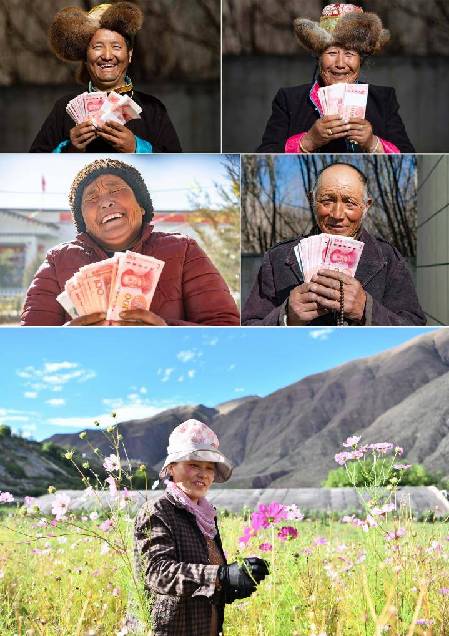 上四圖為2021年2月9日,山南市乃東區(qū)克松社區(qū)領到分紅的農民興高采烈(記者普布扎西攝);下圖為西藏昌都市察雅縣卡貢村村民在當?shù)孛缙援a(chǎn)業(yè)基地采集鮮花種子,曾經(jīng)的建檔立卡貧困戶在這里實現(xiàn)了就業(yè),完成了脫貧(2020年9月28日 記者晉美多吉攝)。新華社發(fā)
