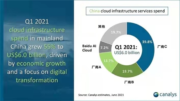 Canalys報(bào)告顯示,在2021年第一季度,中國(guó)云計(jì)算市場(chǎng)規(guī)模達(dá)到60億美元,同比增長(zhǎng)55%,占全球14%,是僅次于美國(guó)的全球第二大云計(jì)算市場(chǎng)。其中,百度智能云等四家云服務(wù)廠商合計(jì)市場(chǎng)份額超過(guò)80%。