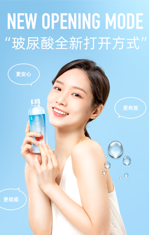 此次宜簡推出的水光飲玻尿酸飲品,每瓶含玻尿酸成分68mg。相較市面上含有玻尿酸成分的產(chǎn)品,一片玻尿酸面膜的含量約為5-15mg,一支玻尿酸針劑的含量約20mg,宜簡水光飲一瓶68mg的添加量無疑是具備市場競爭力的。據(jù)悉,該核心成分源自玻尿酸龍頭企業(yè)--華熙生物的專利原料。據(jù)華熙生物研究,玻尿酸具有良好的保濕性和增強(qiáng)皮膚組織彈性功能,1g玻尿酸可結(jié)合1kg水分,持續(xù)性的補(bǔ)充可以清除體內(nèi)自由基從而延緩組織衰老。簡而言之,就是增加皮膚水分、抗氧化和抗衰老。