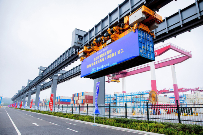 ????今年6月,全球首創(chuàng)智能空中軌道集疏運(yùn)系統(tǒng)(示范段)在山東港口青島港自動(dòng)化碼頭竣工投入試運(yùn)營(yíng)。資料照片