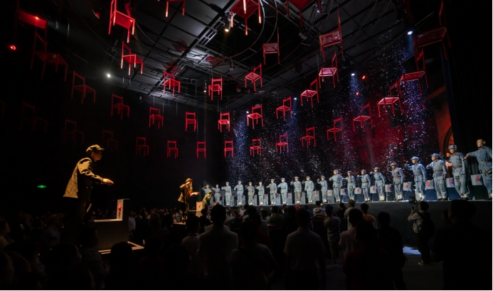設(shè)計(jì)之初,這部劇就盡量打破常規(guī)。觀演方式上,觀眾擺脫常規(guī)的舞臺(tái)鏡框模式,跟隨情節(jié)依次進(jìn)入每個(gè)表演區(qū),“邊走、邊看、邊感受”,完全是沉浸式的體驗(yàn)。其次,這是國內(nèi)首部紅色故事為背景的情景劇,以一本老紅軍日記為線索,展現(xiàn)一個(gè)曲折的故事,表達(dá)對(duì)革命英雄的謳歌與緬懷。在舞臺(tái)創(chuàng)新上,該劇首創(chuàng)巨型開合升降裝置,讓觀眾凝視觸摸碩大的紅旗,極大調(diào)動(dòng)了觀眾情緒,增加互動(dòng)體驗(yàn),這種表達(dá)方式在全國舞臺(tái)藝術(shù)上也有開創(chuàng)意義。