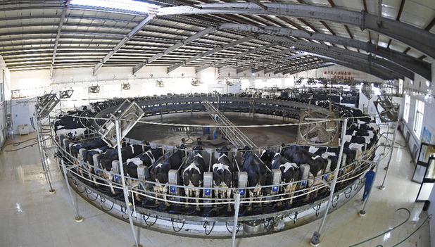 ????擠奶時間剛到,寧夏銀川市賀蘭中地生態(tài)牧場的擠奶大廳里,數(shù)千頭“訓(xùn)練有素”的奶牛便排隊走上重型轉(zhuǎn)盤式擠奶機(jī),10分鐘左右,機(jī)器自動完成擠奶,奶牛又自行排著隊走出擠奶廳。數(shù)百米長的大型標(biāo)準(zhǔn)化棚舍、自走式全混合日糧攪拌車、物聯(lián)網(wǎng)監(jiān)測與分析系統(tǒng)等先進(jìn)設(shè)備在這個牧場已普遍應(yīng)用?!皹?biāo)準(zhǔn)化、自動化、智能化是牧場日常生產(chǎn)的關(guān)鍵詞?!蹦翀鲐?fù)責(zé)人何舉說。