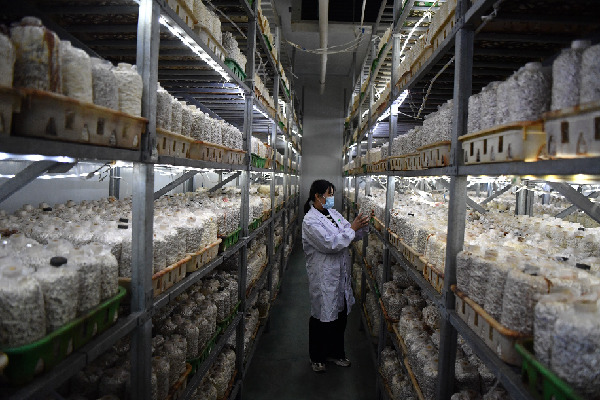 河南世紀香食用菌開發(fā)有限公司員工正在查看白靈菇菌種生長情況。新華社記者 李嘉南 攝