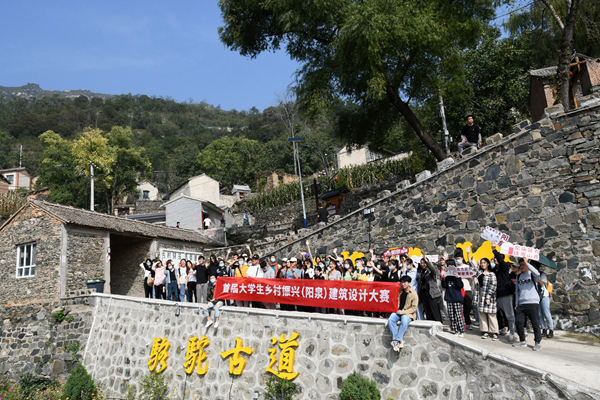 首屆大學(xué)生鄉(xiāng)村振興(陽(yáng)泉)建筑設(shè)計(jì)大賽學(xué)生代表團(tuán)在盂縣駱駝古道考察。陽(yáng)泉市委組織部供圖