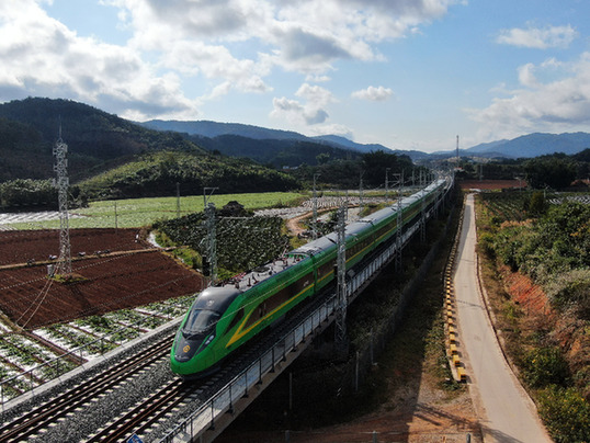 1月3日,列車行駛在位于云南西雙版納傣族自治州景洪市境內(nèi)的中老鐵路上(無人機(jī)照片)。