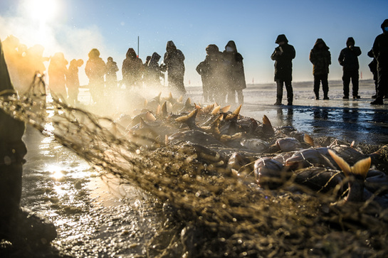 晨曦微露,白茫茫的查干湖面鋪上一層暖色,漁民們齊聲喊著號(hào)子,用“冰镩子”打出冰窟,將長(zhǎng)桿沿著冰窟把漁網(wǎng)送進(jìn)水里。七八個(gè)小時(shí)后,清脆的揚(yáng)鞭聲中,八匹馬喘著粗氣拉動(dòng)絞盤(pán),漁網(wǎng)一寸寸從冰窟里浮出水面,數(shù)萬(wàn)斤魚(yú)在氤氳的水氣中連蹦帶跳地被拉上冰面。游客沸騰了,拍照、選魚(yú)、直播……兩個(gè)小朋友抬起一條30斤的胖頭魚(yú),快樂(lè)歡呼。