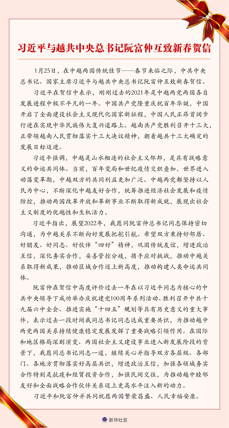 習(xí)近平在賀信中表示,剛剛過去的2021年是中越兩黨兩國各自發(fā)展進程中極不平凡的一年。中國共產(chǎn)黨隆重慶祝百年華誕,中國開啟了全面建設(shè)社會主義現(xiàn)代化國家新征程,中國人民正昂首闊步行進在實現(xiàn)中華民族偉大復(fù)興道路上。越南共產(chǎn)黨勝利召開十三大,正帶領(lǐng)越南人民貫徹落實十三大決議精神,朝著越共十三大確定的發(fā)展目標(biāo)邁進。