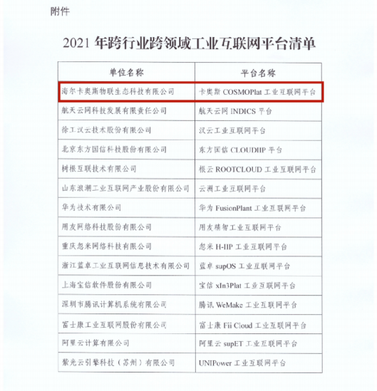 近日,工信部公布了2021年跨行業(yè)跨領(lǐng)域工業(yè)互聯(lián)網(wǎng)平臺(tái)清單,卡奧斯COSMOPlat工業(yè)互聯(lián)網(wǎng)平臺(tái)、航天云網(wǎng)INDICS平臺(tái)、漢云工業(yè)互聯(lián)網(wǎng)平臺(tái)等15家平臺(tái)入選,其中,卡奧斯COSMOPlat位居首位。
