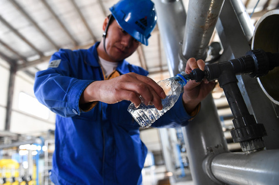 國家能源集團旗下公司廢水處理中心,一名工作人員展示經(jīng)過處理后的污水。記者 劉磊 攝