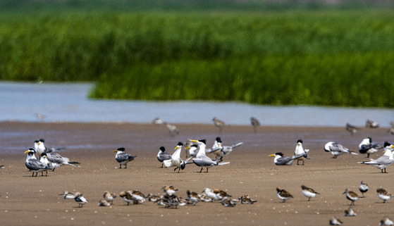 2020年4月19日9時(shí)許,閩江河口處于天文大潮最高潮位,急速上漲的潮水將水中的浮游生物沖上沙洲,記者藏匿于濕地核心區(qū)鱔魚(yú)灘沙洲高地,近距離“邂逅”黑嘴端鳳頭燕鷗。