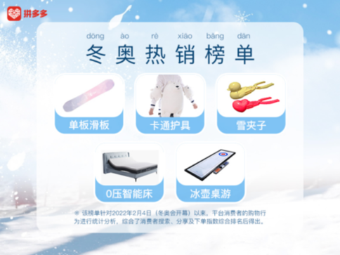 近日,冬奧盛會引發(fā)全民關(guān)注,滑雪等運(yùn)動的關(guān)注度顯著增加,激發(fā)了人們對于冰雪運(yùn)動的參與熱情。健兒們在賽場上拼搏,網(wǎng)友則在網(wǎng)上拼購起了滑雪裝備。2月16日,新電商平臺拼多多發(fā)布冬奧熱銷榜單,自北京冬奧會開幕以來,單板滑雪板、滑雪護(hù)具、0壓智能床、冰壺桌游等商品銷量漲幅明顯。同時冬奧“頂流”IP效應(yīng)明顯,谷愛凌同款、冰墩墩成為熱門搜索詞。