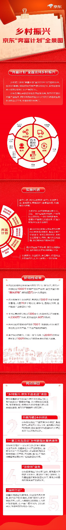 2月22日,21世紀(jì)以來第19個(gè)指導(dǎo)“三農(nóng)”工作的中央一號(hào)文件公布。文件指出,要聚焦產(chǎn)業(yè)促進(jìn)鄉(xiāng)村發(fā)展,強(qiáng)化產(chǎn)業(yè)鏈與創(chuàng)新鏈融合發(fā)展,推動(dòng)下沉供應(yīng)鏈建設(shè)。23日,京東發(fā)布鄉(xiāng)村振興“奔富計(jì)劃”全景圖,全面展示了京東服務(wù)國(guó)家鄉(xiāng)村振興戰(zhàn)略的供應(yīng)鏈、物流、技術(shù)、金融、服務(wù)五大核心能力,并公布了“鄉(xiāng)村振興·京東千縣名品”項(xiàng)目、“千縣萬鎮(zhèn)24小時(shí)達(dá)”、“一基三化五流動(dòng)”鄉(xiāng)村數(shù)智化服務(wù)體系、“診京采”業(yè)務(wù)、“強(qiáng)村行動(dòng)”五大重點(diǎn)項(xiàng)目的最新進(jìn)展。