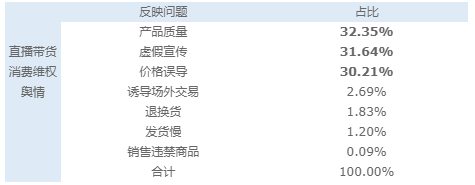 報(bào)告顯示,直播帶貨消費(fèi)維權(quán)輿情反映的主要問題中,涉及產(chǎn)品質(zhì)量問題的占32.35%,虛假宣傳的占31.64%,價(jià)格誤導(dǎo)的占30.21%,誘導(dǎo)場(chǎng)外交易的占2.69%,退換貨的占1.83%,發(fā)貨慢的占1.20%,銷售違禁商品的占0.09%。其中,產(chǎn)品質(zhì)量、虛假宣傳、價(jià)格誤導(dǎo)等直播帶貨問題最為突出。