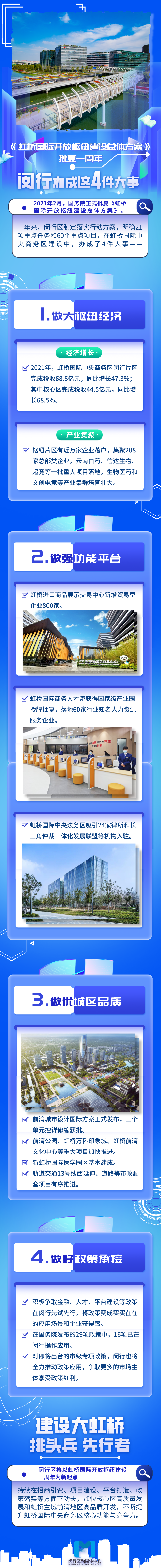2021年2月,國(guó)務(wù)院批復(fù)《虹橋國(guó)際開(kāi)放樞紐建設(shè)總體方案》。一年來(lái),上海全面落實(shí)黨中央、國(guó)務(wù)院決策部署,全力推動(dòng)《總體方案》落實(shí)落地。站在新起點(diǎn),肩負(fù)新使命,虹橋國(guó)際中央商務(wù)區(qū)以“二次開(kāi)發(fā)”“二次創(chuàng)業(yè)”的奮斗姿態(tài),牢牢把握重大機(jī)遇,加快提升核心功能,著力破解瓶頸制約,積極凝聚各方力量,取得了積極成效。