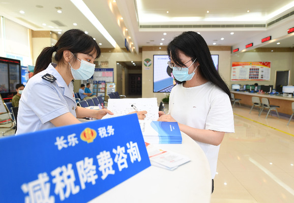 2020年8月19日,在國(guó)家稅務(wù)總局福州市長(zhǎng)樂區(qū)稅務(wù)局辦稅大廳,工作人員在輔導(dǎo)企業(yè)人員辦理減稅降費(fèi)業(yè)務(wù)。新華社記者 宋為偉 攝