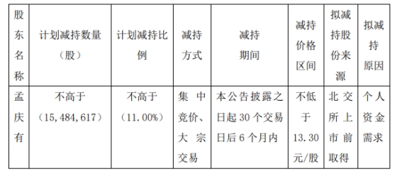 公告顯示,股東孟慶有持有2227.45萬(wàn)股公司股份,持股比例15.82%,當(dāng)前持股股份為北交所上市前取得。因個(gè)人資金需求,孟慶有擬減持不超1548.46萬(wàn)股公司股份,減持方式為集中競(jìng)價(jià)、大宗交易;減持期間為本公告披露之日起30個(gè)交易日后6個(gè)月內(nèi)。