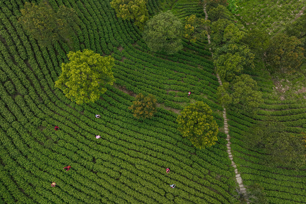 3月27日,茶農(nóng)在浙江省湖州市長興縣和平鎮(zhèn)灘龍橋村的高山茶園采摘茶鮮葉(無人機照片)。