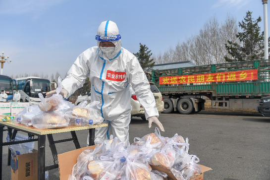 4月9日,在吉林市高速公路口,工作人員為返鄉(xiāng)農(nóng)民準(zhǔn)備餐食。長(zhǎng)春市、吉林市正加快為滯留兩市的農(nóng)民發(fā)放通行證,并組織多種轉(zhuǎn)運(yùn)方式,盡快讓符合條件的農(nóng)民返鄉(xiāng)備春耕。新華社記者 張楠 攝