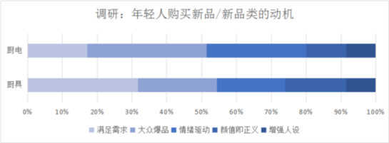 在此前京東發(fā)起的一項調研中,分析35歲以下人群購買廚房電器/廚具的動機可見,年輕人購買廚房電器時,受大眾口碑影響很大,而對廚具的顏值、設計感(增加人設)的敏感度明顯更高。比如近幾年年輕人尤其是女性熱衷購買的顏值琺瑯鍋,無論是馬卡龍色還是鳶尾紫色,擺在廚房就是一道靚麗的風景線。京東春季家裝節(jié)數(shù)據(jù)顯示,鍋具顏值擔當?shù)拇砜岵市驴瞵m瑯鍋在開門紅的前28小時內成交額同比增長15倍。