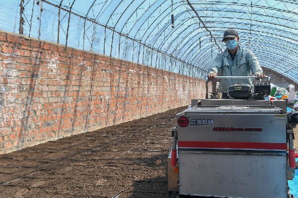 4月15日,在吉林省吉林市龍?zhí)秴^(qū)江北鄉(xiāng)棋盤村,農(nóng)民操作水稻秧盤播種機進行育苗工作。