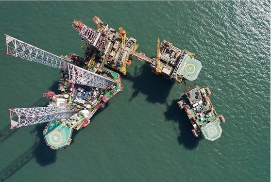 圖為世界首個海上大規(guī)模超稠油熱采開發(fā)油田——中國海油旅大5-2北油田一期項目順利投產。
