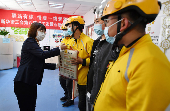 “五一”國際勞動節(jié)來臨之際,寧夏銀川市興慶區(qū)新華街工會開展“驛站有你 情暖一線勞動者”慰問活動。工作人員根據(jù)征集來的“工友微心愿”準(zhǔn)備慰問品,為勞動者送上電飯煲、保溫壺、夏涼被、米、面、油等節(jié)日禮物。