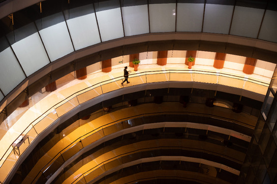 5月4日,在浦東陸家嘴平安金融大廈,平安資產(chǎn)管理有限責(zé)任公司員工陳吉佶和同事開完視頻會(huì)議后,走回辦公室。