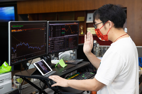 5月4日,在浦東陸家嘴平安金融大廈,平安銀行資金運(yùn)營中心員工林飛一邊監(jiān)測人民幣匯率變化,一邊通過視頻和同事開會(huì)。