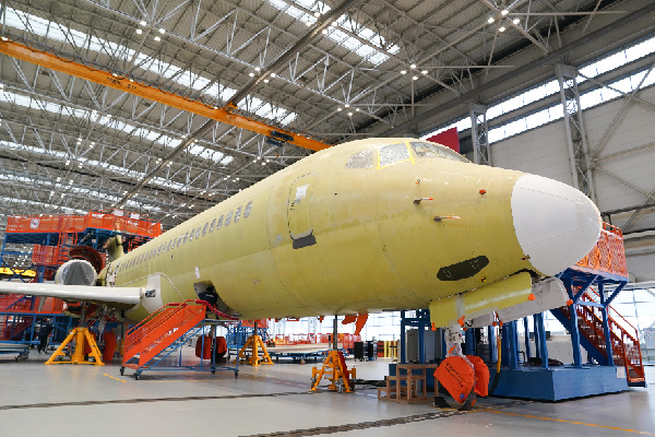 ▲中國商飛上海飛機制造有限公司總裝車間內(nèi)的國產(chǎn)ARJ21飛機。記者 丁汀 攝