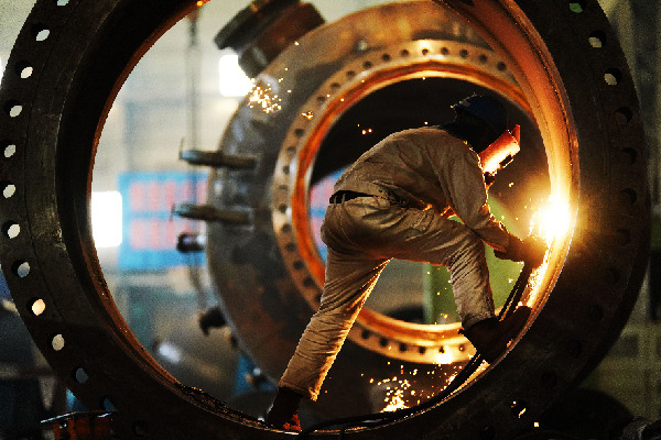 哈電集團(tuán)工人在生產(chǎn)車間作業(yè)。記者 王建威 攝