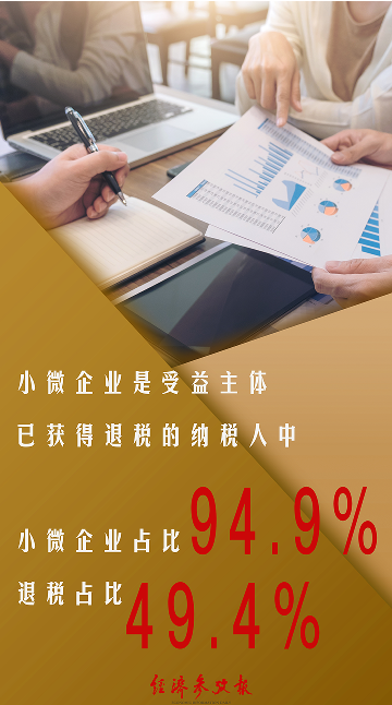 已獲得退稅的納稅人中,小微企業(yè)占比94.9%,共計(jì)退稅7039億元,占比49.4%;中型企業(yè)占比4.4%,共計(jì)退稅3412億元,占比23.9%。