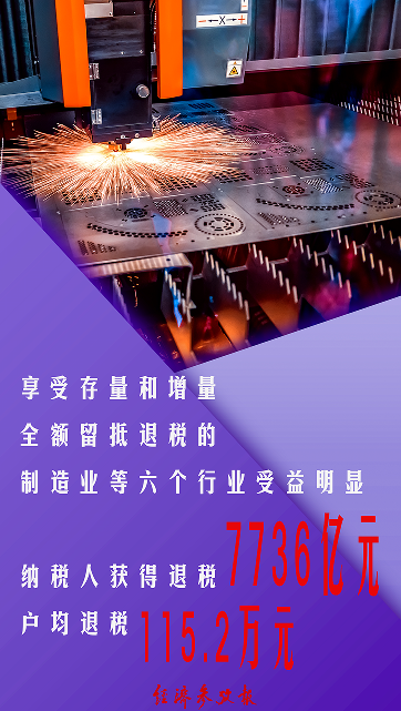 從行業(yè)看,享受存量和增量全額留抵退稅的制造業(yè)等六個(gè)行業(yè)受益明顯,納稅人獲得退稅7736億元,戶(hù)均退稅115.2萬(wàn)元。