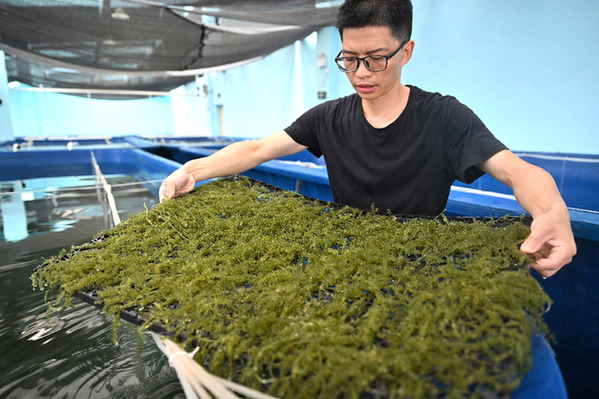 5月31日,工作人員在文昌馮家灣現(xiàn)代化漁業(yè)產(chǎn)業(yè)園養(yǎng)殖示范廠房里查看海葡萄生長情況。新華社記者 郭程 攝