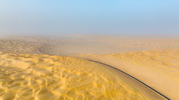面對(duì)風(fēng)沙肆虐的沙漠,建設(shè)者采取“草方格+阻沙障”的風(fēng)沙防護(hù)工程,與公路建設(shè)同步推進(jìn),在公路兩側(cè)鋪設(shè)了5800萬(wàn)平方米草方格和900多公里阻沙障阻擋風(fēng)沙,有效避免公路被風(fēng)沙掩埋。