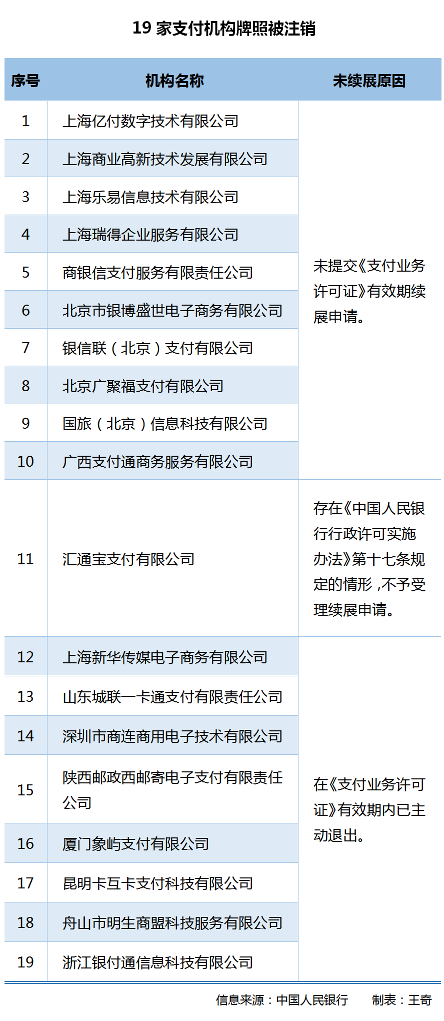 此次公布的續(xù)展結(jié)果,19家注銷的支付牌照中,上海億付數(shù)字技術(shù)有限公司、上海商業(yè)高新技術(shù)發(fā)展有限公司、上海樂易信息技術(shù)有限公司等10家機構(gòu)因未提交《支付業(yè)務(wù)許可證》有效期續(xù)展申請而不再續(xù)展;海新華傳媒電子商務(wù)有限公司、山東城聯(lián)一卡通支付有限責(zé)任公司、深圳市商連商用電子技術(shù)有限公司等8家機構(gòu)在《支付業(yè)務(wù)許可證》有效期內(nèi)主動退出。