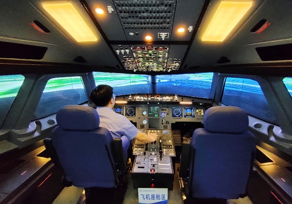 研究人員在全真模擬飛機座艙內(nèi)測試航空器防撞產(chǎn)品(5月12日攝)。 陳冬冬 攝