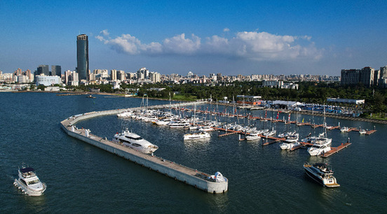 26日,參展游艇駛?cè)牒?趪曳毓泊a頭。當(dāng)日,第二屆中國國際消費(fèi)品博覽會(huì)游艇展在海口國家帆船基地公共碼頭開幕,超過200艘船艇參展。